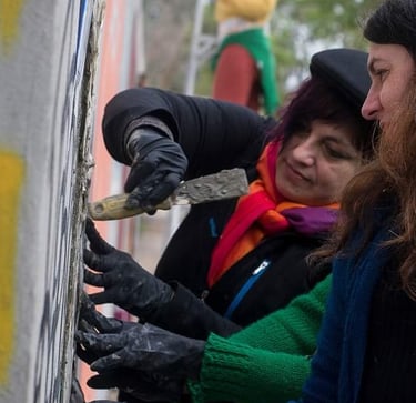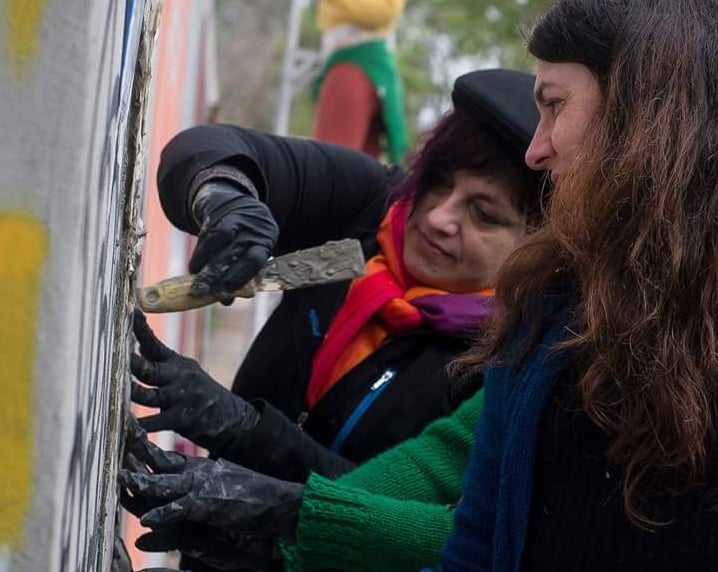 Soy una de las fundadoras de Mosaico Urgente, del lado de la Memoria. Un colectivo de Mujeres que realizamos murales en las paredes de las escuelas, en la vía pública como una ofrenda a los barrios del conurbano bonaerense que habitamos. Una forma de quedarnos en el cotidiano de sus estudiantes y vecinas.