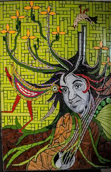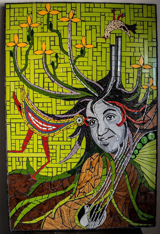 Apenas salía de la adolescencia cuando comencé a entender que los de arriba y los de abajo no se llevan… Dicen que no sabía callarse y qué se le va a hacer! Me lo pegó! Hundí las manos en el barro igualito que Violeta Parra… intenté hacerme cantora (con menos suerte)… tuve dos hijos con uno de sus compatriotas; Viole (vaya a saber por qué), Manu (por su canción para Manuel Rodríguez y Víctor por su gran amigo Jara). Recorrí Chile buscando sus cacharros y arpilleras en vano. A mi regreso, en la ciudad de la Plata, por pura casualidad me las encontré… a escondidas, el extremo de mis dedos se deslizó suavemente por entre los hilos de sus puntadas y tuve que cerrar los ojos frente a la fuerza del reencuentro. Sentí como mi ADN se reacomodaba y terminé la búsqueda. Ahí se quedó, dentro mío para siempre.