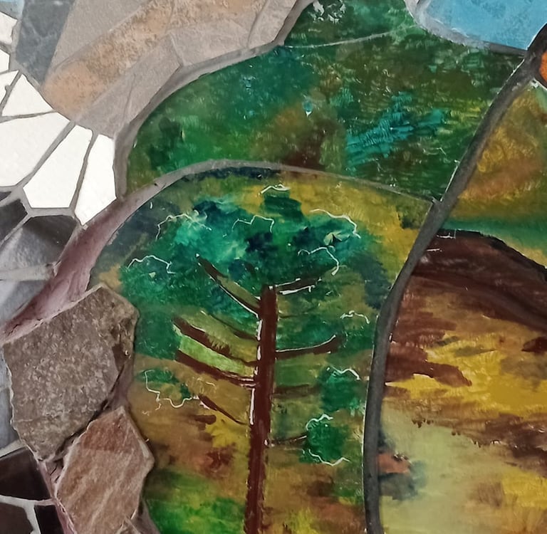 Reutilización de descartes de cerámico, vidrio pintado, piedras de El Saltillo /junio 2023