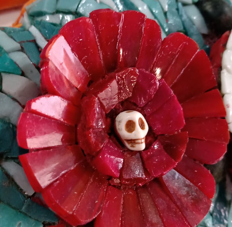 Escogió cuidadosamente las piedras más preciosas, los colores más vibrantes de las entrañas de la tierra: el verde esquivo del jade maya que abre todas las puertas, la promesa del día y la luz inagotable de la turquesa azteca, las piedras incas como granos de maíz, ensambladas para siempre.
