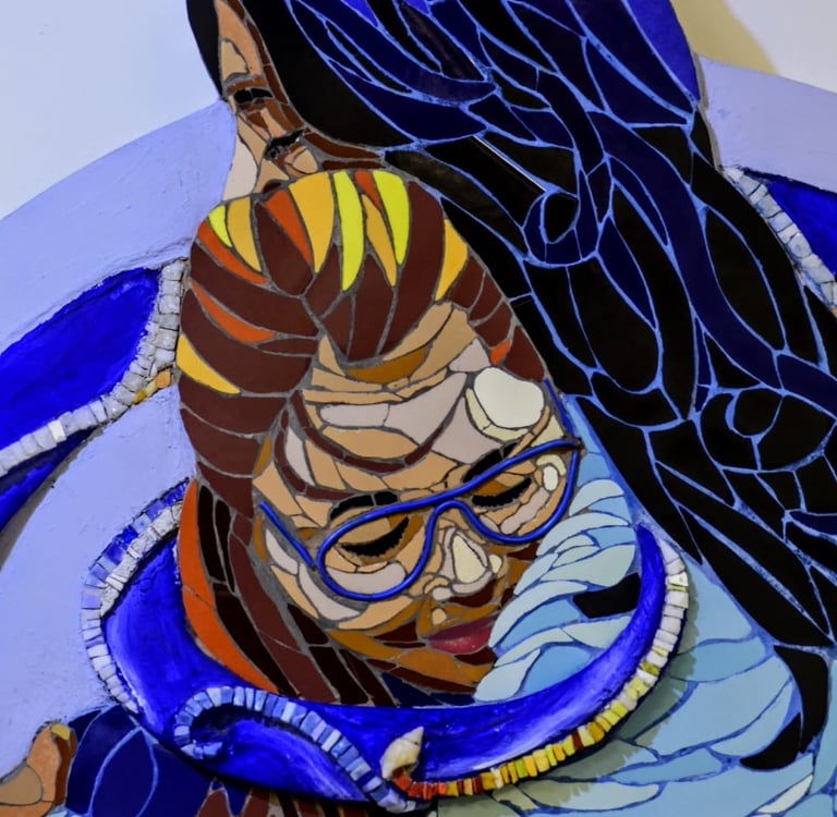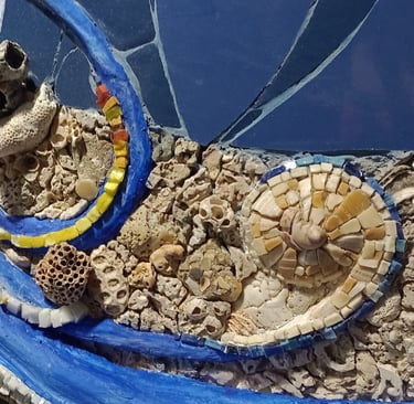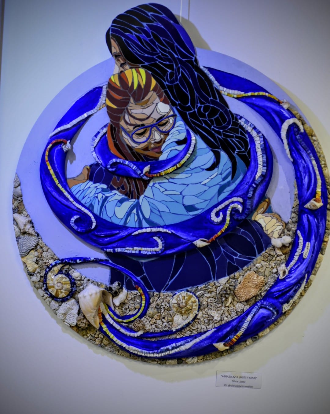 La idea del mosaico se consolidó en la playa, compartimos un amanecer y los dos me regalaron unos caracolitos que son parte importante de esta composición. El mar con su fuerza y misteriosa belleza. Azul, recordando a Mercedes Sosa quien decía que era el color de la felicidad.